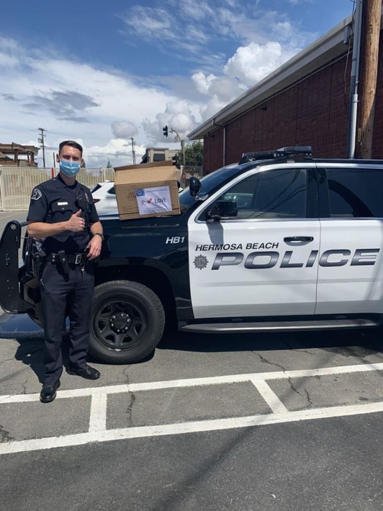 4月7日,在美国洛杉矶县天普市,美国南加州华人联合总会代表向当地一家药店捐赠口罩时合影。(新华社发,美国南加州华人联合总会供图) 华侨华人润物无声的行动受到当地民众称赞。 赫莫萨比奇市警察局在社交媒体上感谢华侨华人赠送口罩的善举,并配上巡逻警官戴着口罩执勤的图片。