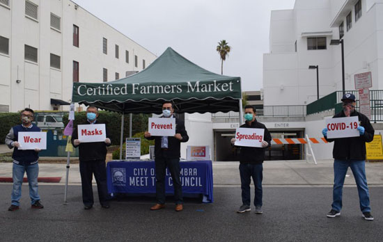 4月5日,在美国洛杉矶农夫市场,阿尔汉布拉市前市长沈时康(左二)与现任市长罗斯·马扎(左三)宣传新冠防疫知识并免费分发当地华侨华人捐赠的口罩。(新华社发) 沈时康对新华社记者表示:“这是我们华人以实际行动积极参与疫情防控,关爱、支持和回馈社区。发放口罩是希望社区民众,尤其是弱势群体能够及时得到急需的防疫用品,将有限的资源给予最需要的人群。” 农夫市场所在的阿尔汉布拉市隶属洛杉矶县,是华人移民人数最多的城市之一,整座城市人口近10万,其中华裔超过一半。 南加州华人联合总会已向30多家机构捐赠了近18万个口罩和大量防护服等物资。他们还将通过与当地连锁药店等合作,直接将口罩等物资分发给当地民众。 洛杉矶县警察局长亚历克斯·比利亚努埃瓦亲自接待南加州华人联合总会代表,接收他们为警方送来的5500个口罩。