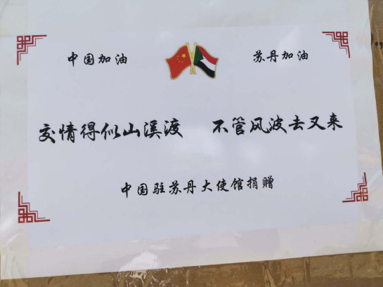 △中国驻苏丹使馆援助物资赠言 此外,在援助阿富汗的医疗物资箱上,印有中文“忧人之忧、情义无价”、“众人同心,其利断金”和阿富汗著名诗句“在困境中向你伸出援手的才是朋友”,为中阿共同防控疫情祝福;在援助黎巴嫩的医疗物资箱上,中方则印上赠言“For shared future”,“为了共同的未来”,展现出中国秉持“人类命运共同体”、团结战胜疫情的坚定信念。