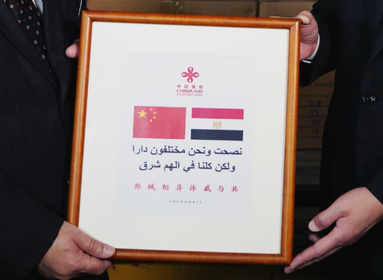 △阿联酋沙迦投资促进署署长参与中阿抗疫远程视频交流 中国第35批援助苏丹医疗队受该国国家新冠肺炎防控中心邀请,录制疫情防控知识讲座。讲座在苏丹国家电视台、喀土穆电视台、苏丹24小时电视台等主流电视媒体播放,为当地人民普及防控知识,广受苏丹各界好评。 援助赠言饱含深情 真挚祝愿打动人心 中国不仅以实际行动真真切切地落实援助,同时也把中国政府和人民最真挚的感情、最美好的祝愿带给疫情下的各国人民。 在向埃及提供的援助物资上,中国政府特意援引了埃及文豪艾哈迈德·绍基的著名诗句:“邦域相异,休戚与共”,以表达在抗击疫情的艰难时刻,中埃两国人民同呼吸共命运的坚实友谊。