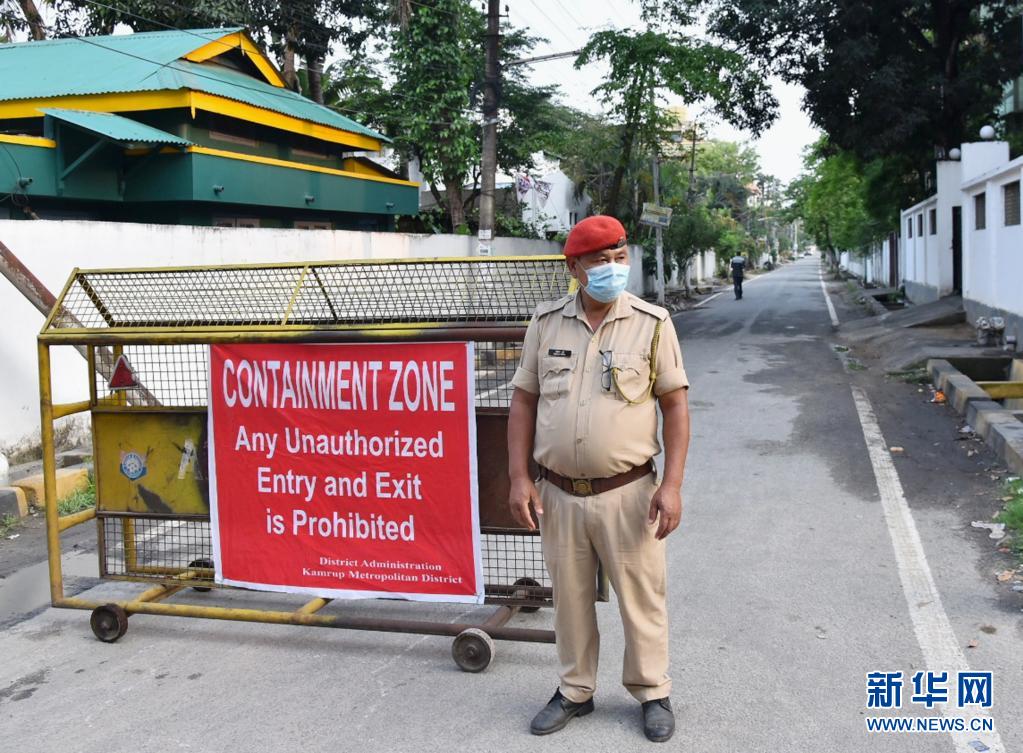 5月6日,安全人员在印度高哈蒂一处隔离区外执勤。新华社发 尽管印度中央政府表示不会实施全面封锁举措来控制不断恶化的疫情,但越来越多的地方政府宣布实施宵禁或封锁。截至6日,包括喀拉拉邦、喜马偕尔邦、马哈拉施特拉邦、奥里萨邦、比哈尔邦和首都新德里在内的10多个邦和地区已宣布实施宵禁或封锁。