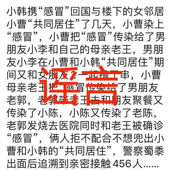 | 疫情期间,各种不靠谱的谣言满天飞。 15日傍晚,黑龙江日报发布快讯:记者从哈尔滨市疫情防控指挥部核实,4月9日公布的哈尔滨市新增本土确诊病例郭某和3例无症状感染者,其感染溯源中提到的曹某楼上楼下邻居——从美国入境人员韩某,系女性,22岁,是从美国回哈的留学生。此前,网络盛传的韩某为男性,是误传。 4月9日开始,哈尔滨市连续出现19例本土新增病例,此前黑龙江省已经连续29天无本土病例,这引起了全国的关注。而感染的源头指向曹某(女,33岁)与从美国回来的韩某。 为何要官方专门声明韩某为女性?皆因近期社交网络上广泛流传一段煞有其事的介绍,声称韩某与曹某存在非正常关系,进而将病毒传播出去。