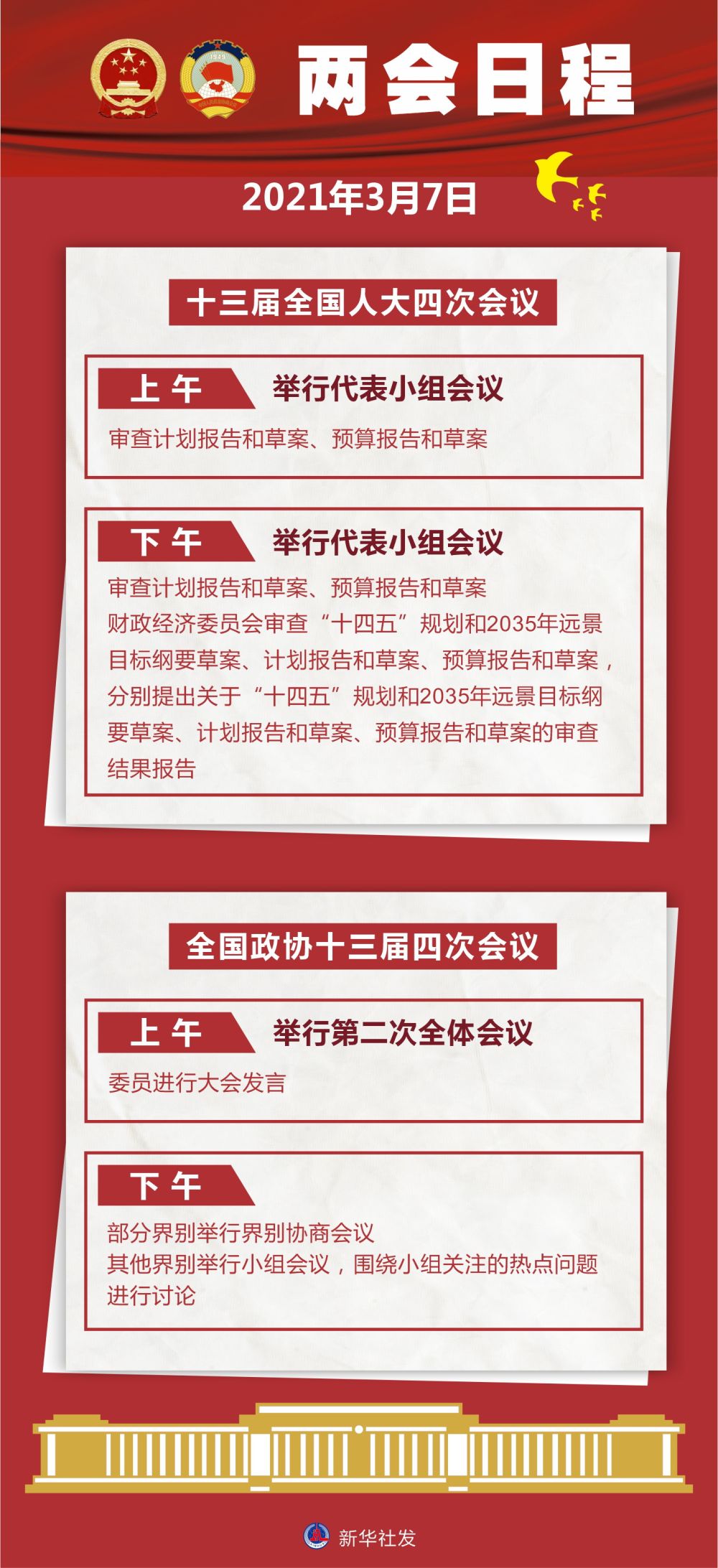 | 新华社北京3月6日电 7日,十三届全国人大四次会议全天举行代表小组会议,审查计划报告和草案、预算报告和草案;下午,财政经济委员会审查“十四五”规划和2035年远景目标纲要草案、计划报告和草案、预算报告和草案,分别提出关于“十四五”规划和2035年远景目标纲要草案、计划报告和草案、预算报告和草案的审查结果报告。 全国政协十三届四次会议7日上午举行第二次全体会议,委员进行大会发言。下午部分界别举行界别协商会议;其他界别举行小组会议,围绕小组关注的热点问题进行讨论。 7日下午3时,十三届全国人大四次会议在人民大会堂新闻发布厅举行记者会,邀请国务委员兼外交部长王毅就“中国外交政策和对外关系”相关问题回答中外记者提问。