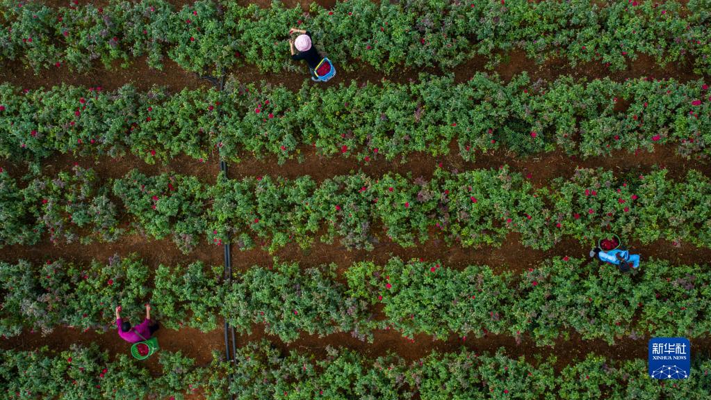 9月9日,云南省弥勒市弥阳街道小河边村村民在采摘鲜食玫瑰(无人机照片)。 近年来,云南省弥勒市弥阳街道小河边村大力推行“合作社+基地+农户”的发展模式,统一规划、流转土地1100余亩建成鲜食玫瑰种植基地,形成集种植、加工和销售于一体的鲜食玫瑰产业链,促进农村产业发展和农民增收致富。 新华社记者 胡超 摄 |