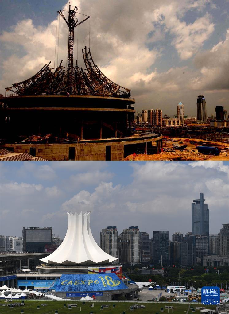 拼版照片:上图为2003年5月7日拍摄的建设中的广西南宁国际会展中心(新华社记者刘广铭摄);下图为2021年9月8日拍摄的南宁国际会展中心(新华社记者陆波岸摄)。 9月10日,为期4天的第18届中国—东盟博览会和中国—东盟商务与投资峰会在广西南宁开幕。 中国—东盟自贸区建成、中国和东盟互为第一大贸易伙伴、区域全面经济伙伴关系协定(RCEP)正式签署……18年来,从服务自贸区建设到助力“升级版”打造,从推动“一带一路”倡议在东盟国家落地生根到推动RCEP早日生效实施,东博会见证了中国—东盟关系逐步成为亚太区域合作中最为成功和最具活力的典范。 新华社发 |