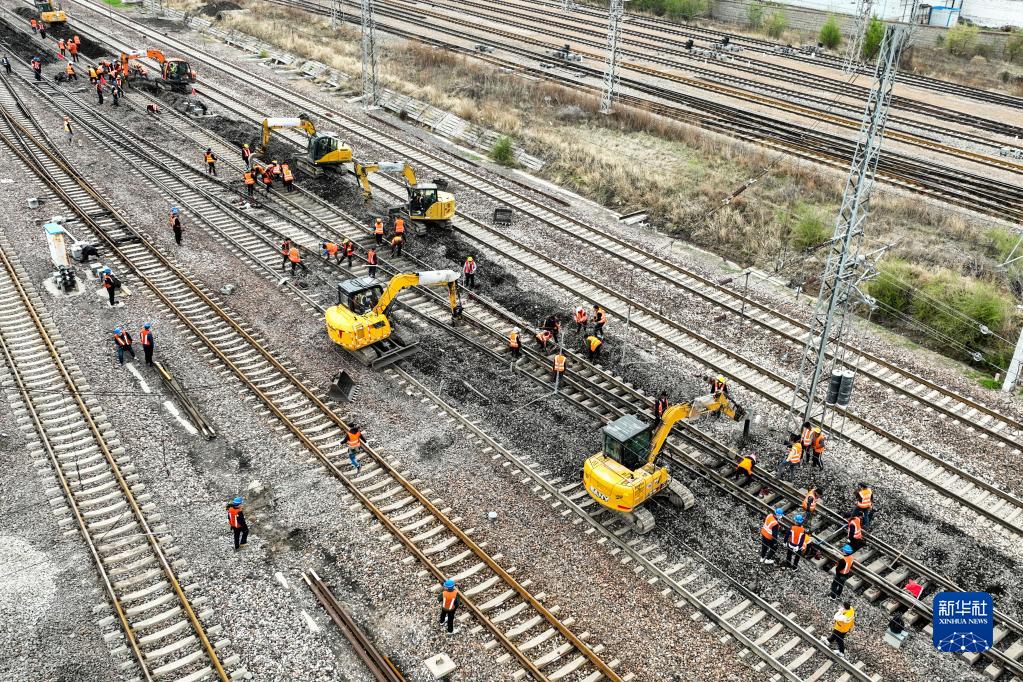 5月11日,中国铁路太原局集团有限公司大同工务段的工人在更换石砟(无人机照片)。 近日,大秦铁路开始为期20天的“体检”,施工人员在全长653公里的重载铁路线上开展大规模、立体式维修养护作业,以确保运输效率和线路安全。 “体检”期间,全线路每天停运3小时,工人将进行更换伤损钢轨、夯实道床、清理淤积物等20余项施工作业。 新华社记者 曹阳 摄 |