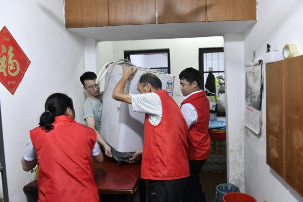 梅汛期,桐庐县志愿者入户帮助村民转移物资。(桐庐县新时代文明实践中心供图) 急难险重面前,桐庐发挥新时代文明实践中心强大动员力,迅速组织起志愿“铁军”。进入梅汛期后,桐庐县连续遭遇强降雨,防汛形势严峻。7月7日启动防洪Ⅰ级应急响应后,新时代文明实践中心根据防汛工作指挥部指令,通过县乡村三级联动指挥系统发布志愿服务需求,指导各所站招募不同类型志愿者,各志愿服务队积极“领单”开展志愿服务。 防汛抗洪的号角吹响,志愿团队闻令而动。阳光公益、富春公益等团队近百名具有专业抢险技能的志愿者第一时间抵达一线。各镇街、村社连夜行动,及时成立党员防汛应急志愿先锋队30余支投入抗洪抢险。志愿者们连夜清理河道淤积物,冒雨设置沿江隔离带,入户帮助村民转移物资,协力转移被困群众,为安置点群众送去饭菜,转发防汛权威动态及时辟谣…… 老城区桐君街道处于沿江地带,人口密集、老旧房屋较多,这次经历了史上最大规模的人员转移。桐君街道专门组建起一支党员应急志愿服务队,集合社区干部、民间专业救援队、公安等力量,一户一户上门劝说、协助,终于在汛情加剧前将所有群众成功转移。党员志愿者吴柏松和其他志愿者一起抬着轮椅,帮助一位百岁老人安全转移。“老人看到我是常 见面的那个‘红马甲’志愿者,很快就同意撤离。”吴柏松说。