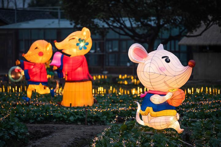看完“乌镇戏剧节”,穿过国乐剧院步行至翡翠漾,一出“乌镇社戏”正在此处上演,精湛的彩灯工艺将剧中人物的一颦一笑刻画得栩栩如生,走进便仿佛能听见剧中人的吟唱声。以国乐剧院为中心,乌镇旧时社戏与当今戏剧遥相呼应,不知你是否也能感受其中咿呀的文化表达呢? 每年水灯会期间,龙形田的大型生肖灯组都是不容错过的亮点。今年,为了体现金鼠闹春的热闹氛围,景区也在这里下了大功夫。整个龙形田由超过5000盏麦穗灯点缀而成,搭配民间故事老鼠娶亲,十余只造型各异的老鼠在龙形田范围内欢欣鼓舞,带着元宝嫁妆向游人送上新年祝福,远远望去,只见张灯结彩、喜烛高照,热闹非常。 水上年市:乌镇人过年的第一道序曲