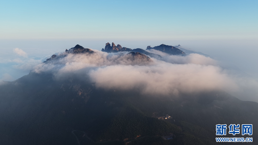 秋日时节,安徽省池州市九华山风景区出现壮丽云海。云涛在山峦间翻涌,巍峨山峰若隐若现,与日出霞光相互映衬,绘就宛如仙境的山水画卷