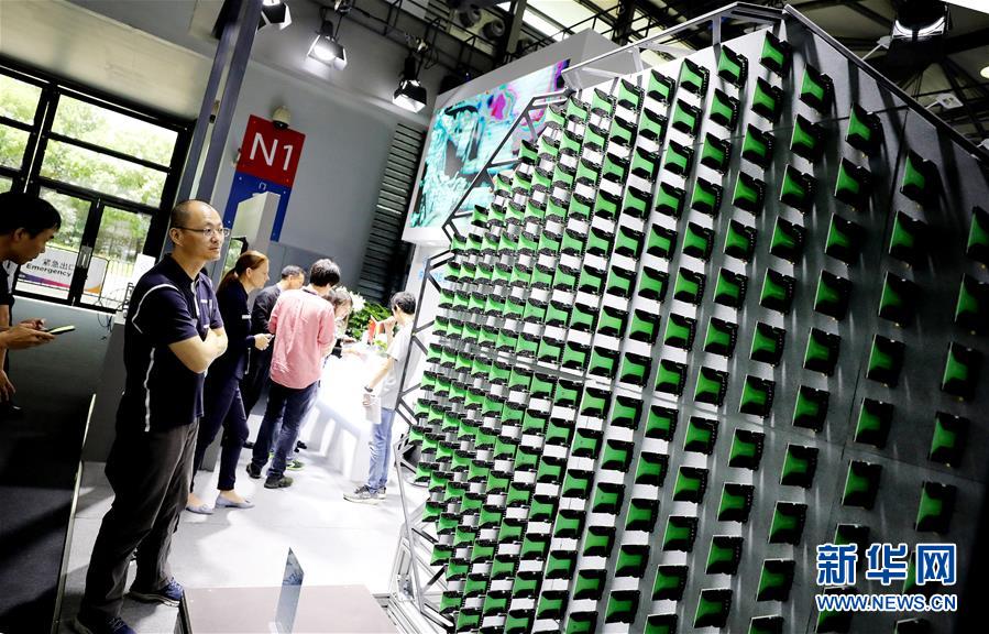 6月27日,参观者在查看一个用于5G信号测试的平面波转换器。新华社记者 方喆 摄