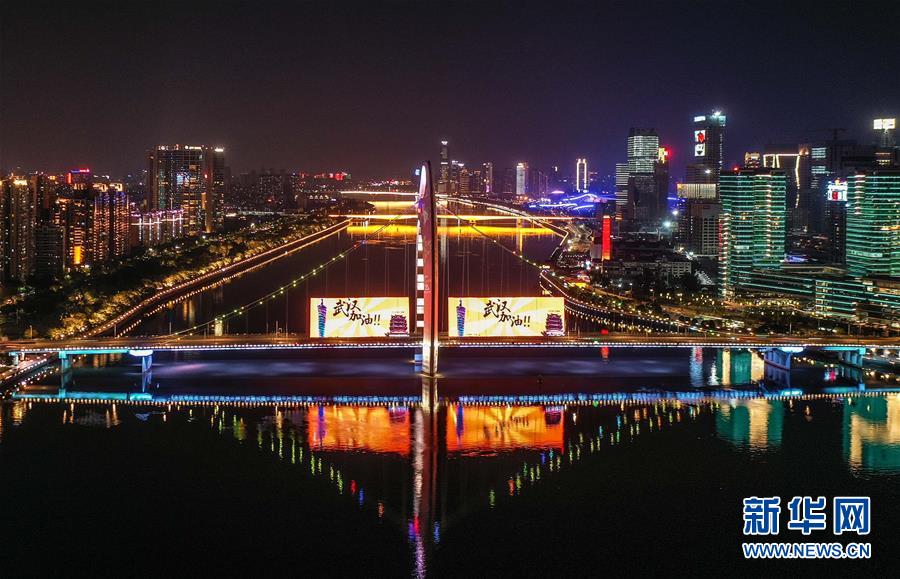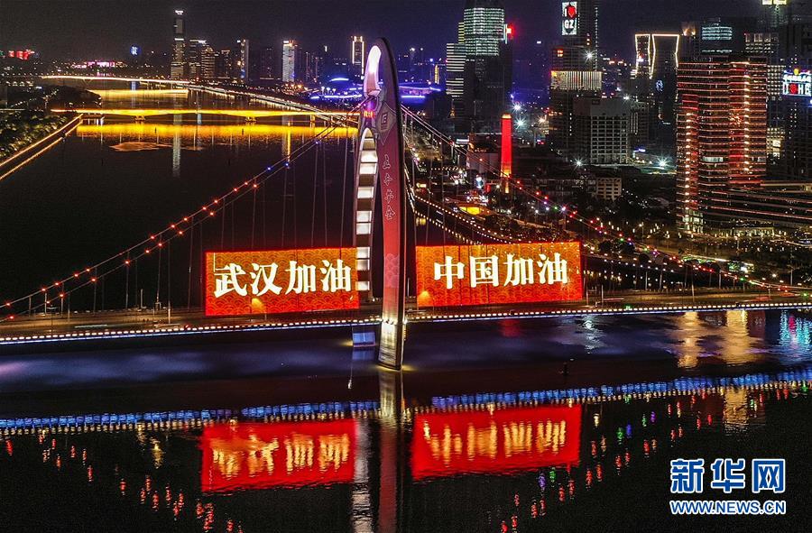 广州珠江上的猎德大桥亮起为武汉加油的宣传海报(1月30日摄)。 春节假期期间,广州多处地标用亮灯方式为武汉加油,为前线医护人员鼓劲,同时向市民传递防控疫情的信心。 新华社记者 刘大伟 摄