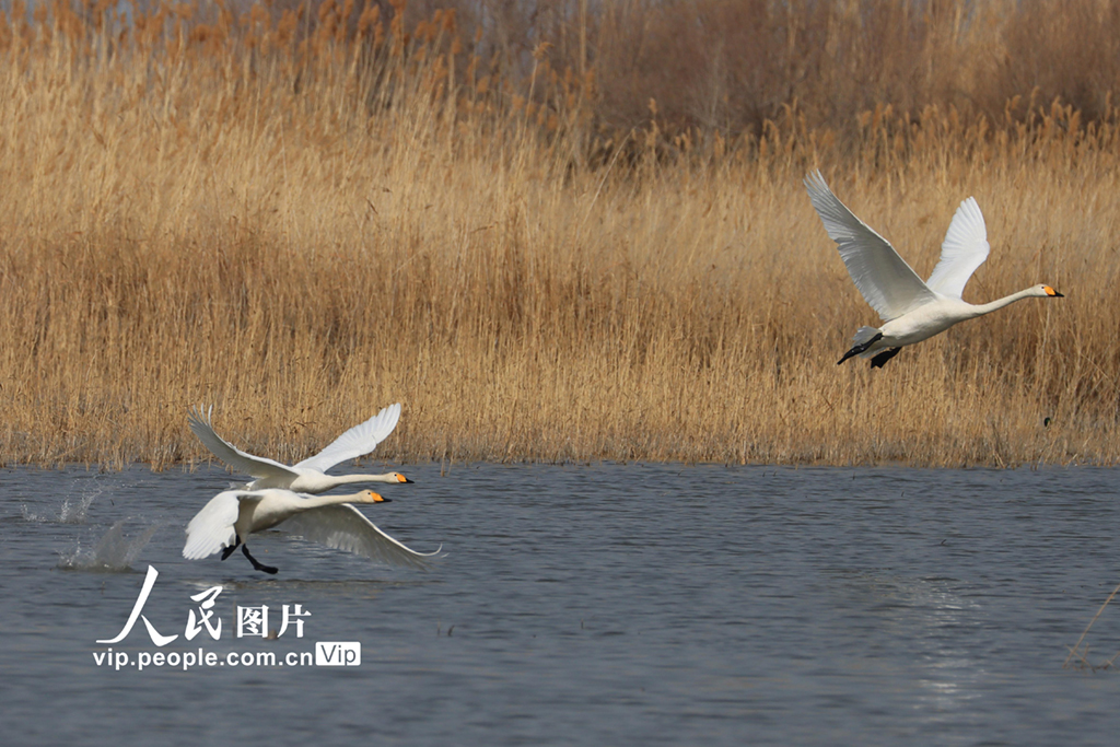 2021年3月15日,在新疆巴音郭楞蒙古自治州博湖县境内的博斯腾湖南岸,众多野生水鸟或腾空盘旋、引吭高歌,或贴水嬉戏、食追逐。 随着气温不断回升,位于新疆巴音郭楞蒙古自治州博湖县境内的博斯腾湖冰雪消融,湖畔迎来了大批候鸟繁衍栖息,它们时而翩飞起舞,时而觅食嬉戏。湖水、芦苇、各类水禽鸟类互为辉映,浑然一体,演绎出一幅美妙的“候鸟天堂”画卷。年磊摄(人民图片网)