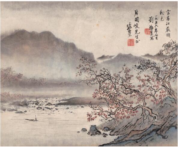 刘海粟画富春江严濑秋色图 早在刘海粟百岁诞辰之际,文化部就给过他两个定语:“新美术运动的拓荒者、现代艺术教育的奠基人”,这个结论显然实至名归。作为中国现代绘画的先驱和翘楚,刘海粟厥功甚伟,在艺术探索过程中始终贯穿海纳百川、兼收并蓄、开拓创新的理念,其间对“创新”的孜孜以求及直面西方文化思潮冲击的文化自信,更体现海派的精神,值得当下深思。 直到今日海粟老人的形象仍常在我脑际弥漫,一位裹着大红高领提花毛衣、嗓门特大的鲜活老人的形象历历在目,可见当年印象之深刻。上个世纪八十年代初,我曾追随乐秀镐先生轧淘,一同拜谒海翁于“上海大厦”的“存天戏海楼”,不但亲聆乡音謦欬,畅言无拘,豪情恣意不减当年,并获其嘱秘书袁志煌转赠《忆陆小曼》一文的抄稿,殊感其高谊可风,日后声名大噪,再见也不易。 我家藏过两张海粟早年的国画,一幅临石涛的山水(已佚),跋语中有“与大滌子血战”,和摹朱耷的游鱼图(尚存),为题“却似八大山人”,足见海翁对自己的底蕴和笔墨功夫相当自傲,尚能与石涛一拼,也不比八大的差。平心而论他确实有本事,自幼习字习画到少年私塾求学,一直受到颇为正统的教育,14岁那年离开故乡常州来到上海,在八仙桥旁一家布景画传习所,跟了一位叫周湘的老画师研习西洋美术及水彩画法,接触到大量西洋画册后,喜欢上了油画,后来老师安排学生外出写生,他顺便上街买了绘制油画的材料,尝试临摹,从此笔耕不辍,在短短两年内完成对西画的体验及其与中国美术的融和,年仅十六岁就崭露头角并脱颖而出,他以开风气之先的胆识与勇气,创办了上海美术图画院(上海美专),因而也是我国现代美术教育的开拓者,培养出众多优秀人才,首创男女同校,并最先提出人体写生课,因而遭受保守势力的谩骂和攻击,甚至被军阀孙传芳通缉,扣上一顶“艺术叛徒”的帽子,备受世人的关注。直到临近上海解放,海粟接到当局通知,让他撤离上海去台湾,经过一番深思熟虑,海粟决计留下迎接解放。 海粟隐居了个把月后,上海远处传来隆隆炮声,5月25日解放军攻入市区,解放了苏州河以南大片地区,上海美专学生朱瑚接到地下党的指示:马上组织学生护校并绘制巨幅的毛泽东、朱德等画像以庆祝解放,朱急忙赶回学校,路过复兴中路巧遇刘校长和训导长同坐一辆三轮车,海粟见到朱瑚也异常激动,振臂欢呼:“解放喽,解放喽!”并一同赶往学校,刘校长当即吩咐自己的助教马承鏣连夜绘制5米高的毛泽东油画像,指示总务处支付画材的全部费用。5月27日大清早,市区居民惊喜地发现,老上海地标建筑“大世界”塔楼上悬挂着巨幅毛泽东的画像,顿时轰动了整个上海。第二天,全民庆祝解放的游行队伍如大潮涌来,刘海粟驻足街头,欣喜地发现,领队方阵竟是他的美专学生,他们肩扛自制的领袖画像,手执横幅彩旗昂首前行,海粟刹那为之动容。 49年以后,刘海粟倡导的新兴艺术流派与徐悲鸿推崇的古典写实主义路线相左,海粟归于岑寂,默默耕耘。1952年全国高校院系调整,上海美专与苏州美专、山东大学艺术系合并成立“华东艺术专科学校”。徐悲鸿对教育部任命刘海粟为华艺院长一职之事发难,后经周总理调停,刘海粟的任命才得以通过。学校搬迁至无锡社桥后,海粟在全校师生见面会上反复阐明:“陈毅市长让我来当这个校长,我能力不够,还需要学习,陈市长说,你不要做具体的事,学校的事情让他们去干,你只要在家从事创作就行了,主持校务的臧校长修养很高,我完全信任他。”获得了在场师生的热烈拥护,年底华东艺专正式宣告成立。 1953年6月刘海粟携早年旧作《群牛图》赴京参加首届全国国画展览,此画再度引发争议,徐悲鸿质疑刘画系抄袭之作,审稿时“怀挟成见”(叶恭绰语)坚主不选,唯有评委叶浅予力争,既无实证不作理会,《群牛图》始得入选,值此懑烦,海粟几乎搁笔,不久徐悲鸿溘然早逝,两人恩怨就此划上句号。 记得海翁的画上常钤一方“静远堂”的印,意在喧嚣中独守静谧,闲暇时沉吟驰想,这是宁静致远,世间的天才,固有其独具的创造力,其感悟力也非同常人,历经数年社会主义大熔炉的改造,刘海粟不禁想起当年也曾起草《美专野外写生团规则》以及带领学生跑到杭州西湖旅行写生的经历,便悄然从塞尚的后印象派风格蜕化,重回写生路线,表明他为艺术而顺应时代的决心,此刻,又想带领他的华艺学生去野外写生,更不失为一种积极的姿态。 富春山水就成了海粟的首选,“由于郁达夫的妙文和当年口头描述的启迪,也为了寻觅故人的诗踪,我曾经几次到浙晥之间的富春江流域去写生。这条江,澄碧如染,曲折处如青龙曼舞,腾空飞下,有些河床直如利剑,劈开群山,仪态万方,自萧山至梅花城,二百余里,是活的山水屏风,在朝曦晚霞中变化无穷,开阖舒卷,一股清气,沁人心脾。”——《漫论郁达夫》 检《刘海粟年谱》1955年10月:游富春江,作中国画《富春江渔乐图卷》、又作《富春江严陵濑雨雾》赠臧云远。 “我还到过七里泷去凭吊过严子陵,石级陡峭,两边茑萝夹道,古树虬蟠,石牌坊上刻着‘千古异人’的横额,祠堂梁头悬着‘高尚其志’的大匾。子陵塑像,清瘦飘逸中饱含着洞察生活的睿智,超脱中无不隐痛。不知什么原因,这一切都使我格外思念达夫,要是我们联袂来游,能添多少乐事啊!达夫异邦客死,化作沃土润奇花,他和严光一