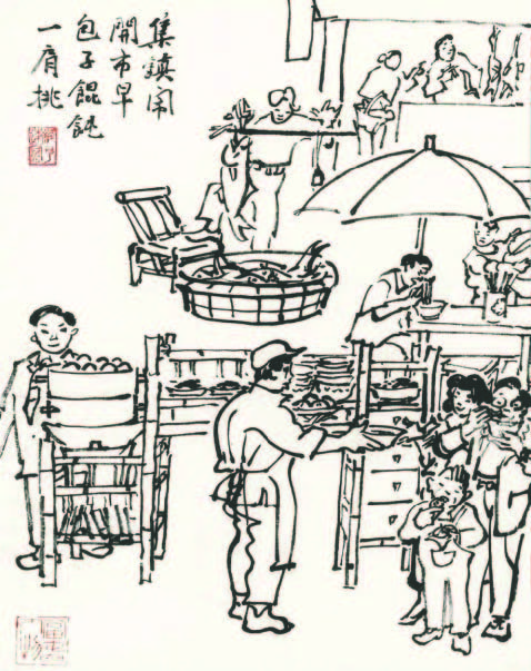 集镇闹,开市早,包子馄饨一肩挑。 此图描绘的是集镇早市的热闹场面。突出反映的是小吃摊点的场景。这样的“浅予速写”,正是生活速写的典型作品。 《现炸油条吃得香》