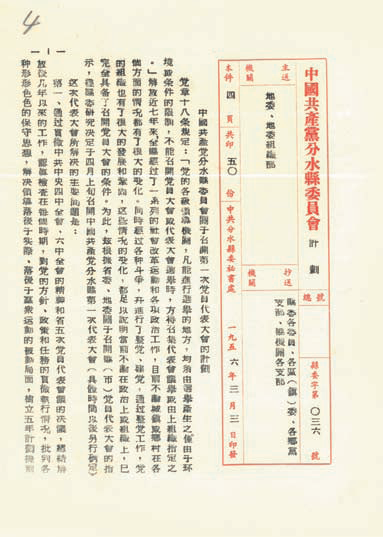 中共分水县第一次党代会计划 1950年5月,桐庐、分水两县分别设立纪律检查委员会,成立人民法院。1951年12月,成立桐庐县人民检察署(1954年12月改称为桐庐人民检察院)。1954年11月,成立分水县人民检察署(1955年1月改称为分水人民检察院)。1954年7月、8月,分水、桐庐两县县委分别建立常务委员会。县委领导均由上级党委任命,桐庐县曾调任县委书记6任(包括3任代理);分水县曾调任县委书记5任(包括3任代理)。1956年6月,两县先后召开第一次党员代表大会,分别选举产生中共桐庐县、分水县第一届委员会,桐庐县委设立13个工作机构,分水县委设立12个工作机构,并作出了关于加强党的纪律检查工作的决议。文化大革命期间,全县党政领导机关一度瘫痪,党的组织生活停止。1979年7月21日,中共桐庐县第五次代表大会召开,选举产生中共桐庐县第五届委员会。为适应经济建设和改革开放的新形势,按照革命化、年轻化、知识化、专业化要求调整了县委领导班子。至1987年12月底,全县共设5个镇党委、32个乡党委。 政权组织建设 1949年5月,桐庐县和分水县分别成立县人民政府,隶属建德专署。1950年4月至1953年2月,两县隶属临安专署;1953年2月至1955年3月,两县隶属金华专署;1955年3月,两县隶属建德专署。1958年10月撤销分水、新登两县建制合并为桐庐县,1959年1月隶属金华专署。1960年4月,桐庐县隶属于杭州市人民委员会。1950年4月,按照《中国人民政治协商会议共同纲领》的规定,桐庐、分水两县分别召开首届一次各界人民代表会议,建立各界人民代表会议制度。新中国成立初期,两县各界人民代表会议的召开不定时间,每改选一次称为一届,每一届召开大会的次数视需要而定。1954年7月,桐庐、分水两县分别召开首届人民代表大会第一次会议,改各界人民代表会议制度为人民代表大会制度,改直接选举为间接选举,人民政府改称人民委员会,选举产生人民委员会委员、县长、副县长、县人民法院院长。1966年秋,县和基层政权组织遭受文化大革命冲击,人民代表大会制度就此中断。1976年10月粉碎江青反革命集团后,全县各级政权组织陆续调整、逐渐恢复并不断完善。1980年4月根据全国人大《中华人民共和国地方各级人民代表大会和地方各级人民政府组织法》和《中华人民共和国全国人民代表大会和地方各级人民代表大会选举法》,恢复了县、公社(镇)两级人民代表大会制度,选民直接选举县、公社(镇)两级人民代表。1980年11月,召开第七届人民代表大会第一次会议,撤销革命委员会,重新建立县人民政府,选举产生人民代表大会常务委员会、县长、副县长、县人民法院院长、县人民检察院检察长,并建立了县人大常委会工作机构。 为了适应新时期统一战线工作需要,经省、市委批准,1984年1月成立中国人民政治协商会议桐庐县委员会筹备小组。4月15日,召开中国人民政治协商会议桐庐县第一届委员会第一次全体会议,选举产生常务委员会,正式成立中国人民政治协商会议桐庐县委员会。 群团组织建设 农民协会。1949年9月、10月,桐庐、分水两县分别召开首届县农民代表会议,成立县农民协会委员会。其时,各级农民协会合法地成为实行土改的主要领导和执行机构,在领导农民开展减租征粮、剿匪反霸、实行土地改革等工作中起到了重要作用。1954年初实行农业合作化后,农民协会完成历史使命,停止活动。 工会组织。1950年5月、11月,桐庐县、分水县先后成立总工会筹备委员会。1951年7月、8月,桐庐县、分水县先后召开首次全县工会会员代表大会。1953年9月,两县总工会改称工会联合会。1959年4月,恢复县总工会名称。文化大革命期间,县总工会被迫停止活动。1977年5月县委再次建立县总工会筹备小组,9月召开县第七次工会会员代表大会,选举产生第七届委员会,桐庐县总工会恢复。 妇女组织。1950年10月、11月,分水、桐庐两县分别召开首届妇女代表大会。1957年4月,两县民主妇女联合会均更名为妇女联合会。两县各级妇女组织建立后,在加强自身建设的同时,紧紧围绕党的中心任务开展妇女工作,发挥党联系妇女群众的桥梁和纽带作用,在各个时期的社会主义革命和建设中,团结带领全县妇女投身政治、经济、文化建设,起到了妇女“半边天”的作用。 团的组织。1949年10月,建立中国新民主主义青年团(1957年7月改称共产主义青年团)浙江省桐庐县和分水县工作委员会,团工委领导由上级任命。1967年初至1971年9月团组织瘫痪。1971年9月14日,召开了共青团县第九次代表大会,团组织恢复。1978年10月,召开共青团县第十次代表大会,选举产生第十届团县委,团的工作恢复正常。在县委的领导下,各级团组织积极投身各项政治运动,参加社会工作和劳动生产,并在运动中得到锻炼和成长,是党联系和团结各界群众的桥梁和纽带。 热血沸腾的基础建设 1949年的桐庐,如一幅饱经沧桑的古卷,在历史长河中翻开崭新一页。彼时的桐庐,城区规模狭小,仅沿江河零星分布几处聚落,交通依赖自然水道与崎岖山道,各项基础设施百废待兴。 电力建设 点亮山城的光明之路