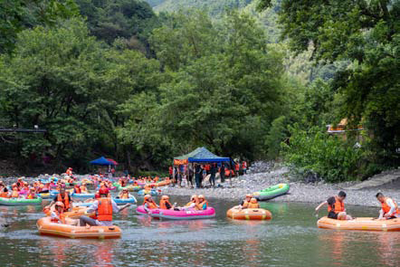 夏日的雅鲁激流探险漂流景区一角 2016年5月26日,全国全域旅游创建工作现场会在桐庐县召开。 桐庐借此东风,在全域旅游创建工作上全面发力。2020年5月6日,桐庐向全球官宣“桐君山永久免费开放”。9月9日,桐君山、瑶琳仙境、严子陵钓台、大奇山、天目溪漂流、红灯笼等六个景区从“民营”回归“国营”。各地古村落景区保护、开发和建设更是紧锣密鼓,逐渐形成了以深澳古村落为代表的“望得见山、看得见水、记得住乡愁”的独特乡村景观风貌。2020年12月,国家文化和旅游部正式认定桐庐为第二批国家全域旅游示范区。桐庐围绕旅游产业,不断加大项目招引和建设力度,持续实施“造月摘星”行动,积极招引亿元以上文旅项目,丰富旅游产品供给,提升旅游产业综合实力。总投资20亿元的开元森泊旅游度假区项目将杭州马术中心、瑶琳仙境等资源串联,打造集“吃住玩游购娱”于一体的华东区域一站式旅游度假目的地;总投资约60亿元的中国·桐庐富春江影视基地等项目签约落地,将开辟出“文旅+影视”等新赛道,形成更加多元的文旅产品矩阵。 在重大项目推动旅游产品质的飞跃的同时,桐庐不断创新产品形态,让众多传统景区“老树发新芽”。创新求变的,不止瑶琳仙境。红灯笼外婆家景区在原有风貌的基础上,植入高端度假酒店与亲子游乐设施,摇身变为“山水古村+轻奢度假”的复合型目的地。而垂云通天河景区则借助AR技术转型为“OMG心跳乐园”;天子地山野乐园嵌入20余个潮玩项目,被众多游客称为“山野乐园天花板”;虎啸峡漂流衍生出的“山野水世界”更成为华东夏日玩水新地标。严子陵钓台、浪石金滩等多个传统景区的提升改造工程也在不断刷新“进度条”,以“蝶变”带动更多山水资源转化为场景化体验。梅蓉村借力中国美院团队,将千亩稻田打造成“黄金左岸”大地艺术展厅,2023年,《桐庐山水艺术季:营造乡村旅游的艺术新空间》入选全国十大艺术和旅游深度融合经典案例;石舍村以文创激活资源,“舍庐艺术馆”“洒秀”咖啡馆与芦毛红茶舍串联起独特文创生态圈;翙岗古村则以叶浅予国漫IP为媒,让漫画“旧时光”与国潮碰撞。这些实践,为桐庐注入了更丰盈的文化肌理。 2025年,“戏水王国·浪在桐庐”品牌迭代升级,以“浪起六次方”为脉络,将山水禀赋与文旅创新深度融合,为游客铺陈出一幅从白昼到星夜、从惊险到治愈的全维度戏水画卷,获评“华东六省一市最佳漂流目的地”称号;“春游桐庐·时光正好”春季IP则整合了自驾游、农业观光等多元业态,让千年文化基因以年轻人喜闻乐见的方式破圈。 更具流量思维的是活动策划。桐庐半程马拉松将赛道铺陈在富春江畔,跑者穿梭于青山绿水间,打造出“奔跑在画中”的独特体验;江鲜大会则以“美食+潮玩”模式,活动期间线上线下互动量高达数百万次,极大提升了桐庐“江鲜第一城”的品牌知名度……