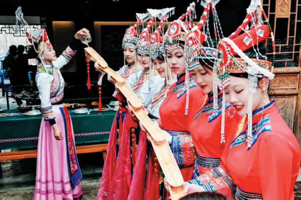 “三月三”又称“乌饭节”,是畲民祭祖祈福的盛大日子。相传唐代畲族英雄雷万兴率众抗敌,困守深山时靠采食乌稔树叶充饥,最终突出重围。后人遂于每年此日采乌稔叶捣汁浸米,蒸出乌黑油亮的乌米饭,以此铭记先祖的坚韧与智慧。而今踏入莪山,空气里浮动着乌米饭独有的草木芳香,软糯滋味入口,尝见的是千年不改的畲乡风味。 这一天,身着“凤凰装”的畲族姑娘手捧米酒,唱着清亮的迎客歌。在村口的古树下,或许会遇到编织彩带的畲家姑娘。五彩丝线在指尖翩跹流转,织出的图腾里,既有驱邪纳福的吉祥祝祷,也藏着畲家女儿含蓄的心事。要知道,彩带可是畲族青年男女传情定亲的信物。跟着学上几针,便也算把这份千年的温柔带在了身边。