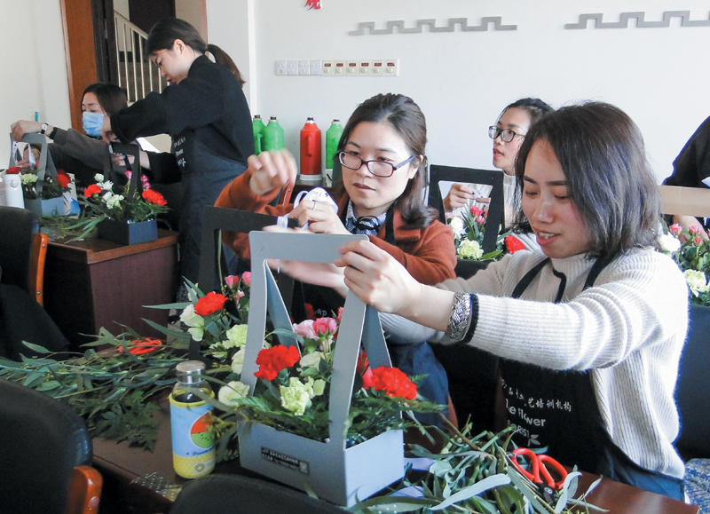学花艺 迎三八 http://www.tlnews.com.cn/ 2018年03月08日 09:08:23 星期四 近日,富春江成校举办以“我与花儿来个约会”为主题的迎“三八”艺术插花培训活动。现场,妇女们在花艺师的指导下,学习鲜花保养知识和家居插花技巧。 作者:记者 单佳铭 通讯员 王晓群 摄 编辑:丁丽