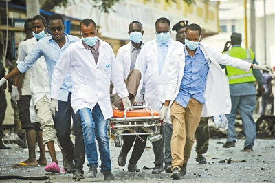 日前,索马里首都摩加迪沙遭到两起汽车炸弹袭击,造成包括袭击者在内的10人死亡、26人受伤。索马里“青年党”宣称制造了这两起汽车炸弹袭击。图为医护人员在救助伤者。 ■非洲各国应通过加强跨境监控、提高公众意识、赋能弱势青年群体来消灭恐怖主义。 ■铲除恐怖主义滋生的土壤,防止青年思想极端化,正在成为非洲国家关注的重点。