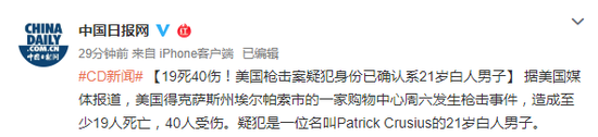 19死40伤!美国枪击案疑犯身份确认系21岁白人男子 http://www.tlnews.com.cn/2019年08月04日 09:42:45 中国日报网 据美国媒体报道,美国得克萨斯州埃尔帕索市的一家购物中心周六发生枪击事件,造成至少19人死亡,40人受伤。疑犯是一位名叫Patrick Crusius的21岁白人男子。 原标题: 19死40伤!美国枪击案疑犯身份确认系21岁白人男子 作者: 网络编辑:吴晓斌