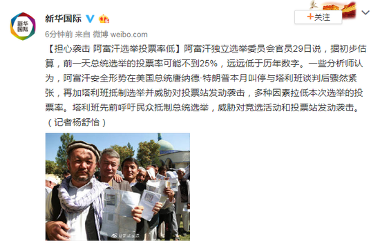 | 阿富汗独立选举委员会官员29日说,据初步估算,前一天总统选举的投票率可能不到25%,远远低于历年数字。一些分析师认为,阿富汗安全形势在美国总统唐纳德·特朗普本月叫停与塔利班谈判后骤然紧张,再加塔利班抵制选举并威胁对投票站发动袭击,多种因素拉低本次选举的投票率。塔利班先前呼吁民众抵制总统选举,威胁对竞选活动和投票站发动袭击。(记者杨舒怡)