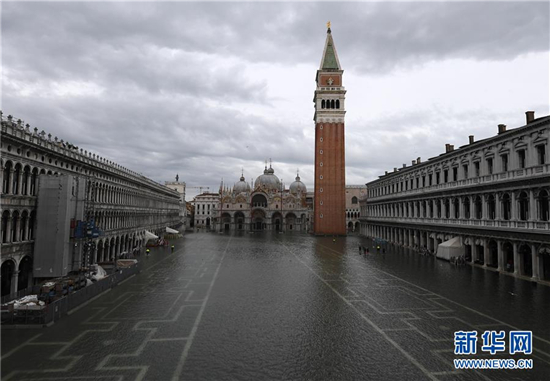 这是11月17日在意大利威尼斯拍摄的受洪水侵袭的圣马可广场。 受极端天气影响,威尼斯近日遭遇严重洪灾。 新华社发(埃莉萨·林格里亚摄)
