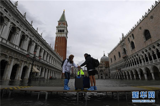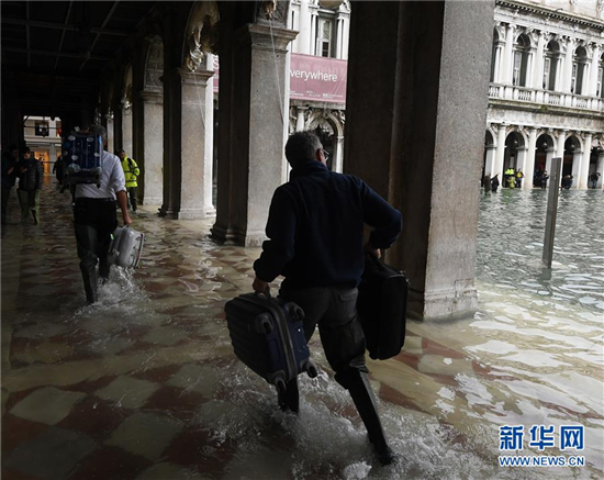 11月17日,在意大利威尼斯,人们涉水出行。 受极端天气影响,威尼斯近日遭遇严重洪灾。 新华社发(埃莉萨·林格里亚摄)