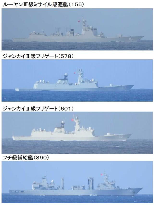 日本P-3C巡逻机拍摄的中国海军舰艇编队 日本防卫省称,编队包括中国海军的052D型驱逐舰南京舰(舷号155),054A型护卫舰扬州舰(舷号578)、南通舰(舷号601)以及903A型补给舰巢湖舰(舷号890)共计4艘军舰。随后中国海军舰艇编队经宫古海峡进入东海。 日本方面炒作“中国海军穿越宫古海峡”早已不是罕见之事。中国国防部新闻发言人曾就此回应称,“这主要是(日方)心态没有调整好,心病还没有治好。也许是因为以往中国军舰过宫古海峡过少了,那么今后我们多过几次,日方习惯了,也就好了。”
