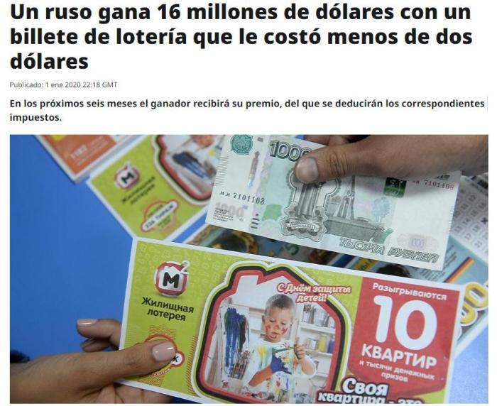 俄罗斯RT新闻网报道截图。 公司称,今年共售出5360万多张新年彩票,也是新年彩票发行25年来售出彩票最多的一次。 新闻处指出,这张中奖彩票是在莫斯科市售出的。 目前还不清楚中奖幸运儿的姓名,但Stoloto公司希望中奖者能很快前来联系领奖,并讲述计划如何支配奖金。