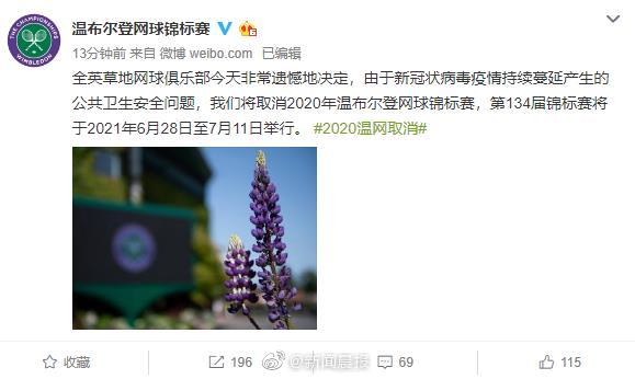 官宣!2020温网因疫情取消 http://www.tlnews.com.cn/2020年04月02日 08:41:21 温布尔登网球锦标赛 据@温布尔登网球锦标赛 ,由于新冠状病毒疫情持续蔓延产生的公共卫生安全问题,将取消2020年温布尔登网球锦标赛,第134届锦标赛将于2021年6月28日至7月11日举行。 原标题: 官宣!2020温网因疫情取消 作者: 网络编辑:吴晓斌