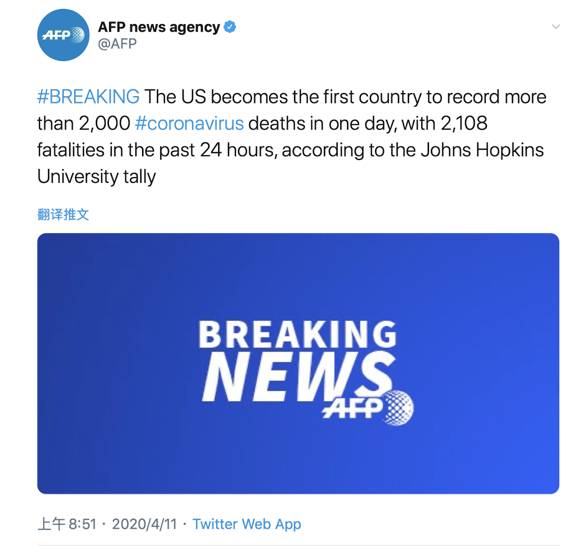 | 外媒:美国成全球首个单日新增死亡病例超2000国家 |