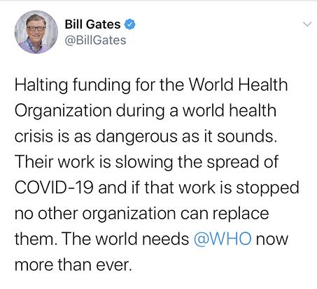 | 针对特朗普宣布美国将暂停资助世界卫生组织(WHO),美国盖茨基金会联席主席比尔·盖茨15日通过社交媒体发文表示,在公共卫生危机发生期间,停止对世界卫生组织提供资金支持,这很危险。世卫组织的工作正在减缓疫情的传播速度,如果这项工作停止,任何其他组织都无法取代他们。世界比以往任何时候都更需要世卫组织。