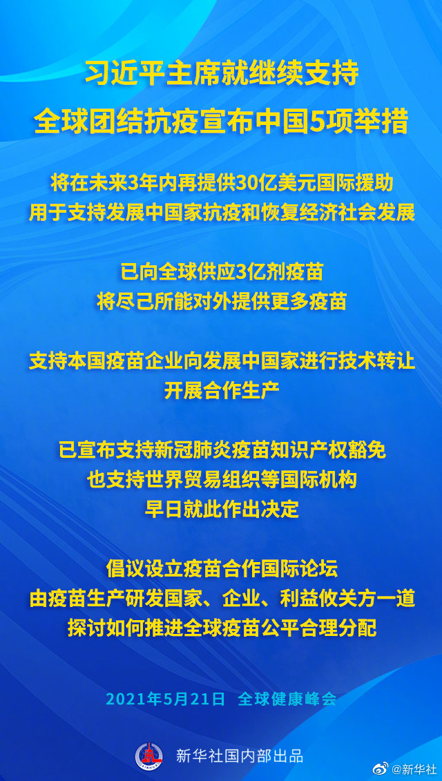 | 5月21日晚,国家主席习近平在北京以视频方式出席全球健康峰会并发表重要讲话。 习近平宣布中方继续支持全球团结抗疫新举措。 第一,中国将在未来3年内再提供30亿美元国际援助,用于支持发展中国家抗疫和恢复经济社会发展。 第二,中国已向全球供应3亿剂疫苗,将尽己所能对外提供更多疫苗。 第三,中国支持本国疫苗企业向发展中国家进行技术转让,开展合作生产。 第四,中国已宣布支持新冠肺炎疫苗知识产权豁免,也支持世界贸易组织等国际机构早日就此作出决定。 第五,中国倡议设立疫苗合作国际论坛,由疫苗生产研发国家、企业、利益攸关方一道探讨如何推进全球疫苗公平合理分配。