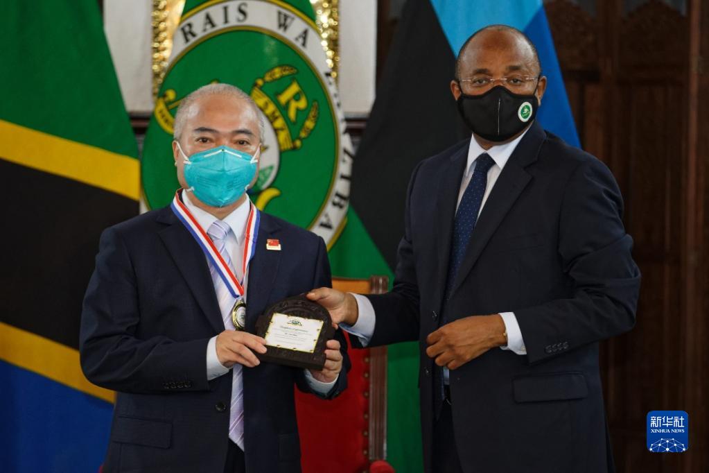 坦桑尼亚桑给巴尔总统向中国医疗队授奖 http://www.tlnews.com.cn/2021年09月23日 08:41:54 新华网 9月21日,坦桑尼亚桑给巴尔总统姆维尼(右)在桑给巴尔总统府为中国医疗队队员颁发荣誉证书。坦桑尼亚桑给巴尔总统姆维尼21日在桑给巴尔总统府向第30期中国援桑给巴尔医疗队队员授奖,表彰他们在当地医疗工作中的杰出表现。新华社发(中国医疗队供图) 原标题: 坦桑尼亚桑给巴尔总统向中国医疗队授奖 作者: 网络编辑:杨露萌