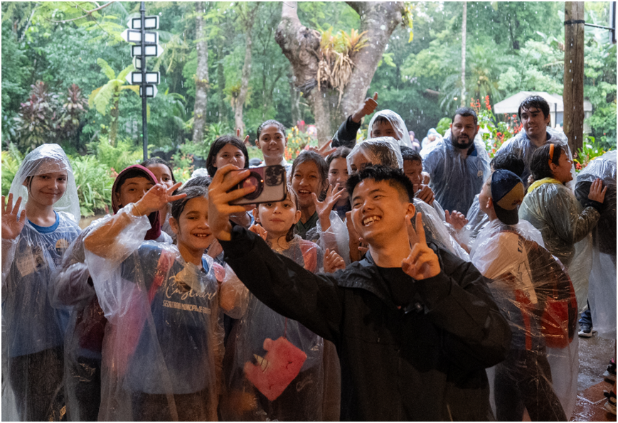 视频博主徐楚涛和偶遇的伊瓜苏小学生们合影。 这样的瞬间,在参访途中不断上演。来自广东的徐楚涛曾担心语言障碍会让旅程显得枯燥,可现实却给了他“巨大的惊喜”。走在圣保罗街头,常有年轻人主动过来合影、互关社交账号。一个笑容、一个握手,就是最好的沟通方式。在他看来,巴西“是一个能容纳全世界文化的、充满人情味的包容之地。”身为青年书法博主的徐楚涛,特意带来了中国宣纸。在11月18日弗鲁米嫩塞联邦大学孔子学院的交流活动中,他教巴西友人书写“福”字。“这张薄薄的纸,成为我们相遇的‘实体记忆’。”