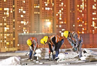 近日,在广西柳州柳东新区国际会展中心三期项目工地,夜班工人在屋面作业。黎寒池摄(影像中国)