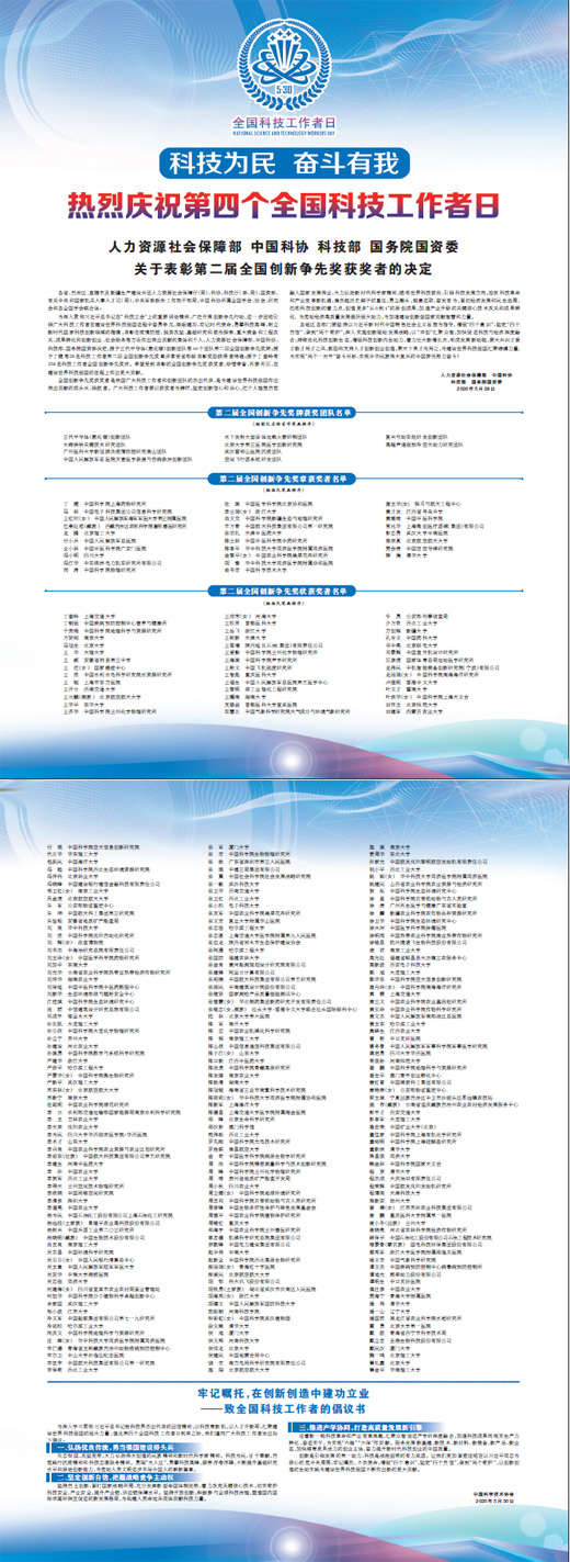 关于表彰第二届全国创新争先奖获奖者的决定 人力资源社会保障部 中国科协 科技部 国务院国资委 各省、自治区、直辖市及新疆生产建设兵团人力资源社会保障厅(局)、科协、科技厅(委、局)、国资委,有关中央和国家机关人事人才司(局),中央军委政治工作部干部局,中国科协所属全国学会、协会、研究会和各全国学会联合体: 为深入贯彻习近平总书记在“科技三会”上的重要讲话精神,广泛开展创新争先行动,进一步团结引领广大科技工作者在建设世界科技强国进程中奋勇争先、砥砺建功,牢记时代使命,勇攀科技高峰,树立新时代国家科技创新领域的楷模,表彰在疫情防控、脱贫攻坚、基础研究和前沿探索、重大装备和工程攻关、成果转化和创新创业、社会服务等方面作出突出贡献的集体和个人,人力资源社会保障部、中国科协、科技部、国务院国资委决定,授予三代半导体(氮化镓)创新团队等10个团队第二届全国创新争先奖牌;授予丁健等28名科技工作者第二届全国创新争先奖章并享受省部级表彰奖励获得者待遇;授予丁奎岭等258名科技工作者全国创新争先奖状。希望受到表彰的全国创新争先奖获奖者,珍惜荣誉、再接再厉,在建设世界科技强国的征程上作出更大贡献。 全国创新争先奖获奖者是我国广大科技工作者和创新团队的杰出代表,是为建设世界科技强国作出突出贡献的排头兵、领航者。广大科技工作者要以获奖者为榜样,坚定创新信心和决心,把个人理想自觉融入国家发展伟业,大力弘扬新时代科学家精神,瞄准世界科技前沿,引领科技发展方向,抢抓科技革命和产业变革新机遇,肩负起历史赋予的重任,勇立潮头,锐意进取,奋发有为,紧扣经济发展和民生急需,把准科技创新的着力点,创造更多“从0到1”的原创成果,加速产业升级的关键核心技术攻关和成果转化, 为推动经济高质量发展提供强大动力,为加速建设创新型国家贡献智慧和力量。 各地区各部门要坚持以习近平新时代中国特色社会主义思想为指导,增强“四个意识”,坚定“四个自信”,做到“两个维护”,深入实施创新驱动发展战略,以“双创”汇聚众智,加快促进科技与经济深度融合,持续优化科技创新生态,增强科技创新内生动力,着力壮大新增长点,形成发展新动能,要大兴识才爱才敬才用才之风,鼓励和支持人才创新创业创造,聚天下英才而用之,为建设世界科技强国汇聚磅礴力量,为实现“两个一百年”奋斗目标、实现中华民族伟大复兴的中国梦而努力奋斗! 人力资源社会保障部 中国科协 科技部 国务院国资委 2020年5月29日 第二届全国创新争先奖牌获奖团队名单 (按团队名称首字笔画排序) 三代半导体(氮化镓)创新团队 大跨拱桥关键技术研究团队 广州医科大学新冠肺炎疫情防控研究南山团队 中国人民解放军总医院灾害医学救援与伤病救治创新团队 水下发射大型固体运载火箭研制团队 北京大学第三医院医学创新研究院 武汉雷神山医院抗疫团队 空间飞行器系统研发团队 复兴号动车组研发创新团队 高超声速强预冷空天动力研究团队 第二届全国创新争先奖章获奖者名单 (按姓氏笔画排序) 丁 健 中国科学院上海药物研究所 马 林 中国电子科技集团公司信息科学研究院 王红阳(女) 中国人民解放军海军军医大学第三附属医院 巴桑旺堆(藏族) 西藏自治区农牧科学院畜牧兽医研究所 龙 腾 北京理工大学 付小兵 中国人民解放军总医院 仝小林 中国中医科学院广安门医院 冯小明 四川大学 冯江华 中车株洲电力机车研究所有限公司 向 涛 中国科学院物理研究所 杜 斌 中国医学科学院北京协和医院 李兰娟(女) 浙江大学 肖文交 中国科学院新疆生态与地理研究所 辛万青 中国航天科技集团有限公司第一研究院 张伯礼 天津中医药大学 陈士林 中国中医科学院中药研究所 陈孝平 华中科技大学同济医学院附属同济医院 金黎平(女) 中国农业科学院蔬菜花卉研究所 胡 豫 华中科技大学同济医学院附属协和医院 俞书宏 中国科学技术大学 唐玉华(女) 探月与航天工程中心 黄才发 江西省寻乌中学 黄璐琦 中国中医科学院 常兆华 上海微创医疗器械(集团)有限公司 彭志勇 武汉大学中南医院 焦宗夏 北京航空航天大学 樊会涛 中国空空导弹研究院 薛 澜 清华大学 第二届全国创新争先奖状获奖者名单 (按姓氏笔画排序) 丁奎岭 上海交通大学 丁钢强 中国疾病预防控制中心营养与健康所 于贵瑞 中国科学院地理科学与资源研究所 万贤纲 南京大学 马冠生 北京大学 王 华 大理大学 王 威 安徽省泗县第三中学 王 洁(女) 国家癌症中心 王 浩 中国水利水电科学研究院水资源研究所 王 韬 上海市东方医院 王开云 西南交通大学 王云鹏(满族) 北京航空航天大学 王华平 东华大学 王齐华 中国科学院兰州化学物理研究所 王沛芳(女) 河海大学 王松灵 首都医科大学 王岳飞 浙江大学 王树新 天津大学 王香增 陕西延长石油(集团)有限责任公司 王爱勤 中国科学院兰州化学物理研究所 王海斌 中国科学院声学研究所 王彬文 中国飞机强度研究所 王智彪 重庆医科大学 王福生 中国人民解放军总医院第五医学中心 王黎明 核工业理化工程研究院 王耀南 湖南大学 支修益 首都医科大学宣武医院 车慧正 中国气象科学研究院大气成分与环境气象研究所 牛 勇 公安部刑事侦查局 介万奇 西北工业大学 方创琳 新