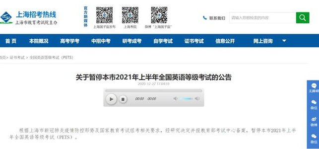 上海:暂停2021年上半年全国英语等级考试 http://www.tlnews.com.cn/2020年12月26日 10:43:09 上海市教育考试院官网 据上海市教育考试院官网消息,根据上海市新冠肺炎疫情防控形势及国家教育考试组考相关要求,经研究决定并报教育部考试中心备案,暂停本市2021年上半年全国英语等级考试(PETS)。 原标题: 上海:暂停2021年上半年全国英语等级考试 作者: 网络编辑:吴晓斌