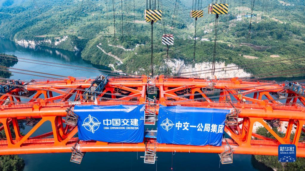 德余高速乌江特大桥顺利合龙 http://www.tlnews.com.cn/2022年08月16日 08:40:17 新华网 8月15日拍摄的德余高速乌江特大桥合龙现场(无人机照片)。当日,由中交一公局承建的德余高速乌江特大桥顺利合龙。德余高速乌江特大桥位于贵州省思南、石阡、凤冈三县交界处,是德江至余庆高速公路的重要控制性工程,大桥全长1834米,主桥为504米上承式钢管混凝土拱桥。新华社记者 陶亮 摄 原标题: 德余高速乌江特大桥顺利合龙 作者: 网络编辑:杨露萌