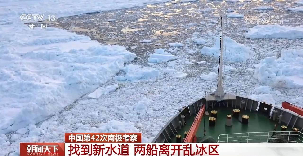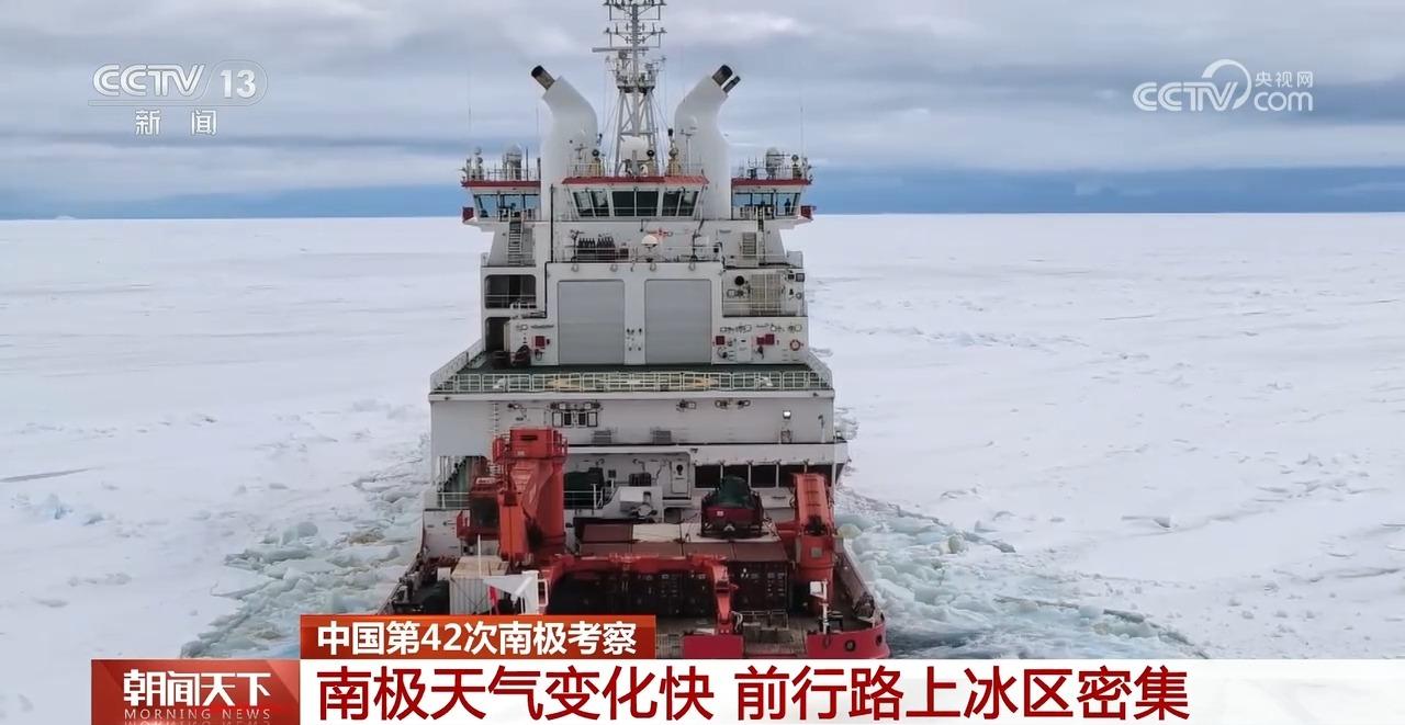 从普利兹湾的固定冰区,一直到外围的乱冰区,两船结伴前行。但是南极的天气变化太快,前行路上的冰区越来越密集,负责靠前破冰引航的“雪龙2”号,走得也并不容易。