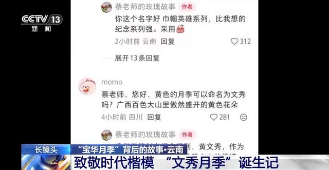 “宝华”在深入的互动中被赋予了文化深度和情感温度。最终,科研团队决定尊重公众选择,将“宝华”作为该品种的正式名称提交申报,目前,已顺利通过国家初审。 致敬时代楷模 “文秀月季”诞生记 如果说“宝华月季”的诞生,充满了偶然与温情,那么紧接着热度上涨的“文秀”一名,则承载了公众自发而深沉的情感。 在另一条月季新品种征名视频中,主角是编号775-1的黄色月季优株,评论区被“文秀”刷屏,而这个名字源于网友希望以“大山的女儿”黄文秀的名字命名,以此致敬这位“七一勋章”获得者、“时代楷模”,研究员蔡艳飞看到后,被网友的建议深深打动。