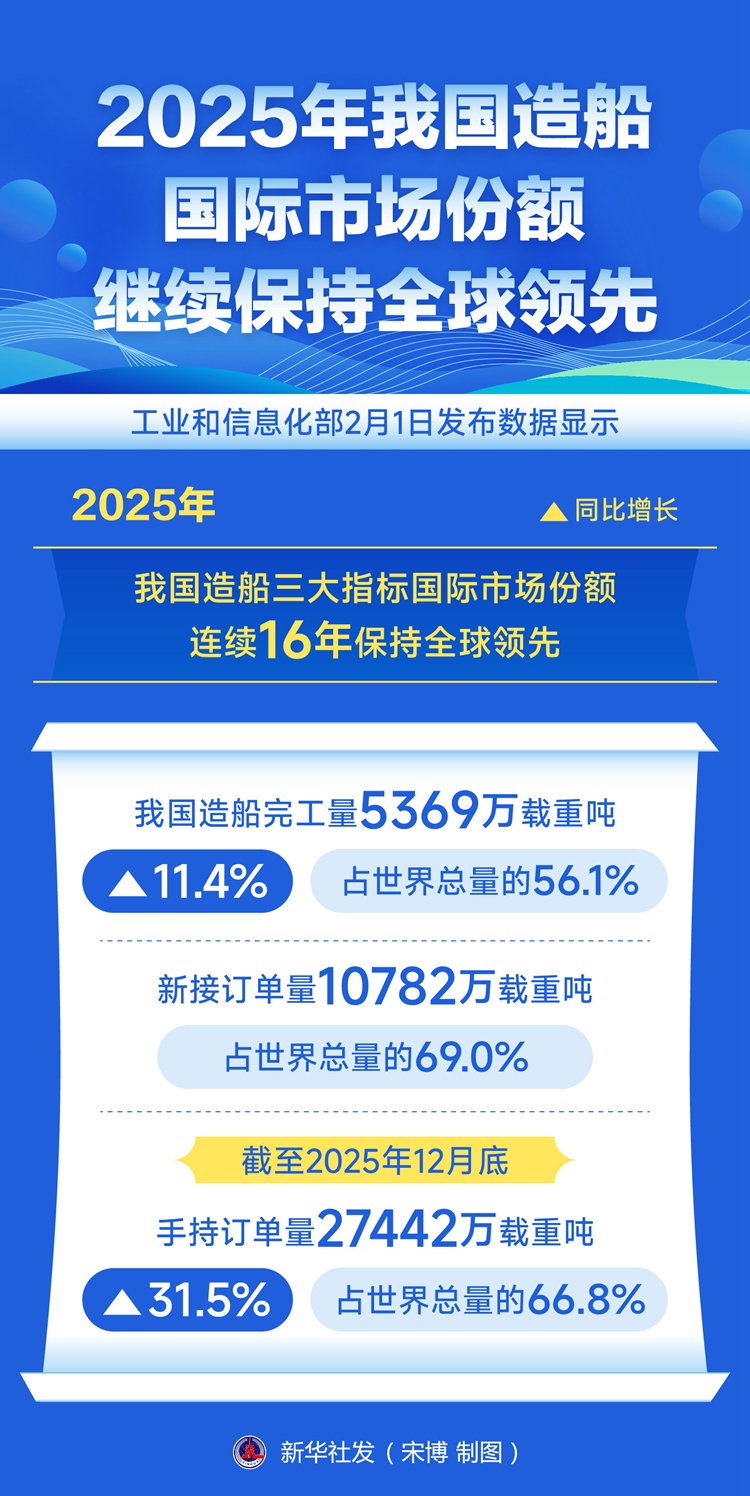 | 新华社北京2月1日电 工业和信息化部2月1日发布数据显示,2025年,我国造船三大指标国际市场份额连续16年保持全球领先。 数据显示,2025年,我国造船完工量5369万载重吨,同比增长11.4%,占世界总量的56.1%;新接订单量10782万载重吨,占世界总量的69.0%;截至2025年12月底,手持订单量27442万载重吨,同比增长31.5%,占世界总量的66.8%。