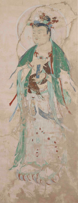 莫高窟第45窟西壁龛内南侧菩萨像 莫高窟盛唐第320窟:元代菩萨像的代表之作 莫高窟第320窟开凿于盛唐,是盛唐时期的代表窟之一。东壁门右侧有一身元代绘菩萨,这尊菩萨像,头戴宝珠花冠,挽高髻,饰巾帼,面相丰满,手持梵夹,披绿巾着裙,跣足而立。造型蕴藉庄重,色彩淡雅,线描流畅,技法丰富,圆转畅达,是元代菩萨像的代表之作。