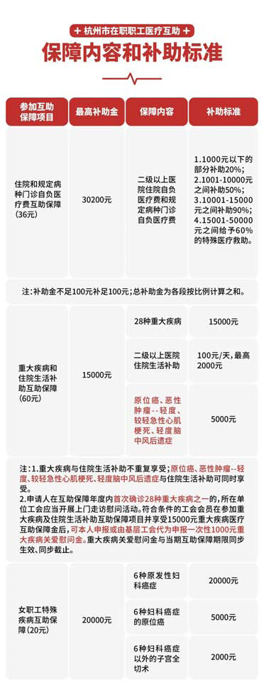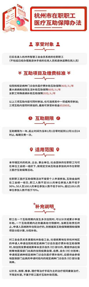 2025年度杭州市在职职工医疗互助补助将于2026年3月31日停止申请,大病关爱慰问金将于2026年4月30日停止申请,符合条件的桐庐职工请抓紧申请。 什么是在职职工医疗互助 《杭州市在职职工医疗互助保障办法》按照“无病我帮人,有病人帮我”的互助理念,包含了住院和规定病种门诊自负医疗费补助互助保障、重大疾病和住院生活补助互助保障、女职工特殊疾病补助互助保障三项内容,被职工视为“第二医保”,在保障职工正常生活,促进企业职工队伍稳定和社会和谐中,发挥着重要作用。换句话说,就是在医保范围之外,医疗互助相当于起了“二次报销”的作用。在一个互助周期内,最高补助金可达65200元。 除外责任 1.不符合参(续)保条件而参(续)保本互助保障的。 2.各种美容、健美项目以及非功能性整容、矫形手术,各种减肥、增胖、增高等项目,不属于职工医疗互助补助范围。 3.各种健康体检及预防、保健性的住院治疗不属于职工医疗互助补助范围。 4.在各类康复医院或康复病区(科室)住院治疗的不属于职工医疗互助补助范围。 5.各种颈椎、腰椎、肩周炎、关节炎等慢性疼痛伤病的非手术治疗的理疗类住院,不属于职工医疗互助补助范围。 6.各类精神疾病住院治疗的,不属于职工医疗互助补助范围。 7.女职工先兆流产、待产等保胎类住院,不属于职工医疗互助补助范围。 8.在医疗机构出具的收费收据上已明确标明的减免、救助、补贴等费用部分和已明确由市、区、县(市)人社局、民政局、卫计委等相关部门或所在单位予以减免、救助、补贴的费用部分不属于住院自负医疗费补助。 9.因违法犯罪、故意自伤、自残、自杀、打架斗殴、酗酒、吸毒、交通事故、工伤事故、医疗事故等原因住院的。 10.在杭州地区以外住院后未经医疗保险参保地区医保结算的。 11.以针灸、按摩、推拿、理疗等治疗手段为主的治疗视同康复治疗,不限定科室,不属于职工医疗互助补助范围。 12.其它非因疾病原因住院治疗的。 申请方式 1.职工申请医疗互助补助 可以直接在“浙里办”App或支付宝“浙里办”小程序,搜索“职工医疗互助”,提交线上补助申请。 2.职工申请大病关爱补助 在“杭工e家”App首页,点击“大病关爱”,从“大病关爱申报入口”进入申请。 注意事项 2025年度杭州市在职职工医疗互助保障报销时间截至2026年3月31日(女职工生育申请补助的延迟至2026年5月31日,在外地住院跨年结算的延迟至2026年6月30日),大病关爱延期至2026年4月30日(大病关爱在“杭工e家”App内申请)。逾期一律不再受理。 2026年达到退休年龄或调离参加单位的,不影响该互助期内的互助待遇,如发生符合补助情形的,可依《办法》规定申请补助。 |