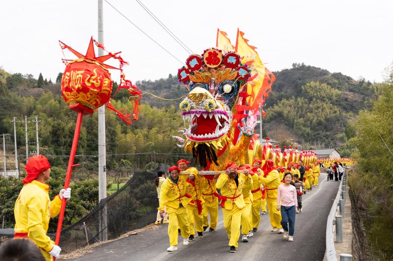吉时已到,龙灯启程。此时,锣鼓喧天,这条近200米的板龙队伍在村委院子绕行几圈,接着穿过村庄、田野,为村民送上新春祝福。