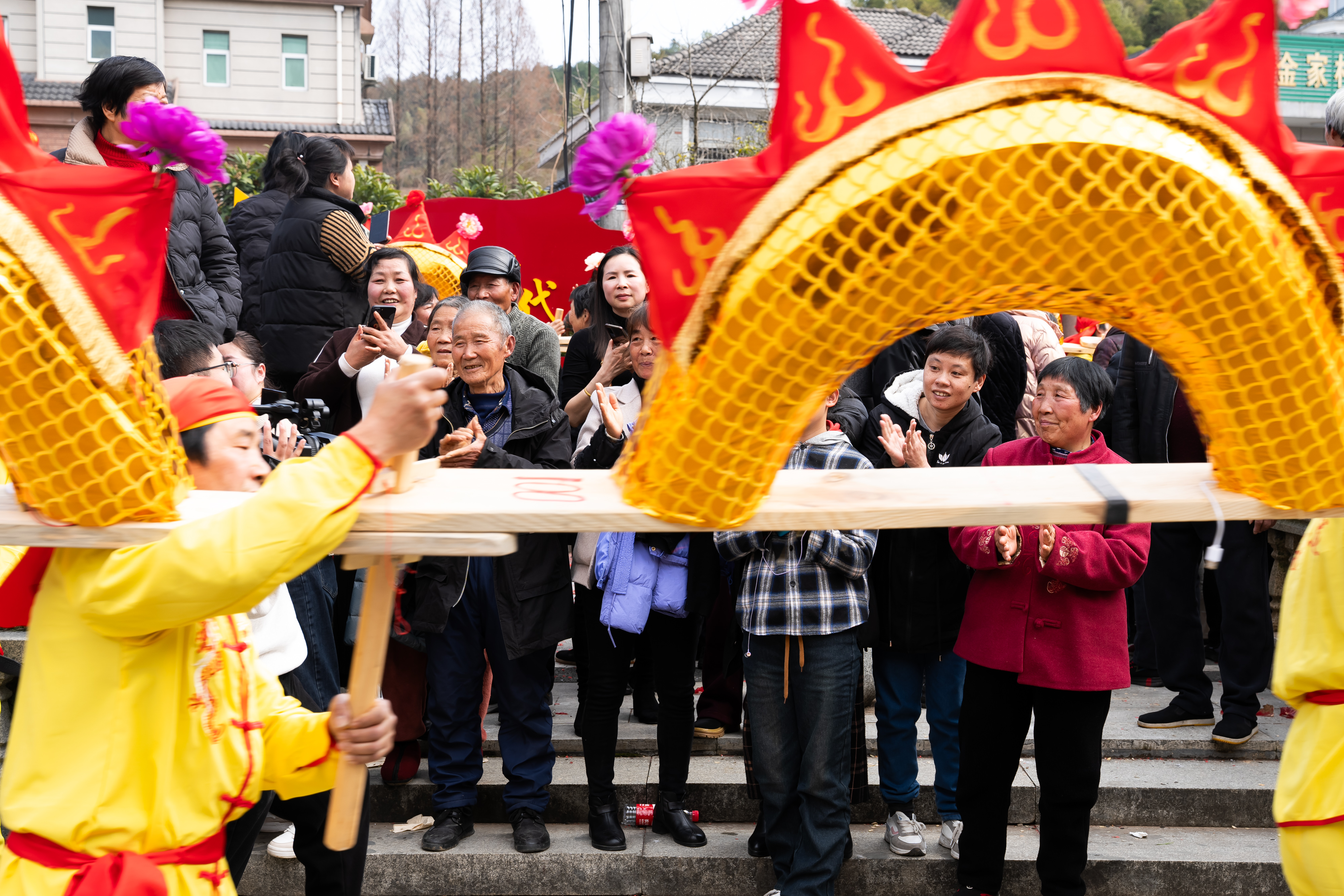 富春江镇金家村板龙始于明朝,已有500多年历史,威武神气,蔚为壮观。此次表演的板龙为全新制作,花了一个半月时间,由108块凳板拼接而成,每块凳板上矗立着一节弯曲的龙身,造型美观、栩栩如生。 虽说板龙表演是金家村的传统民俗,但距离上一次表演已经过去40年,当初青涩的少年早已满头花白,但大家一听说村里又要举行板龙表演,少时的年味涌上心头,便迫不及待地报名参加。