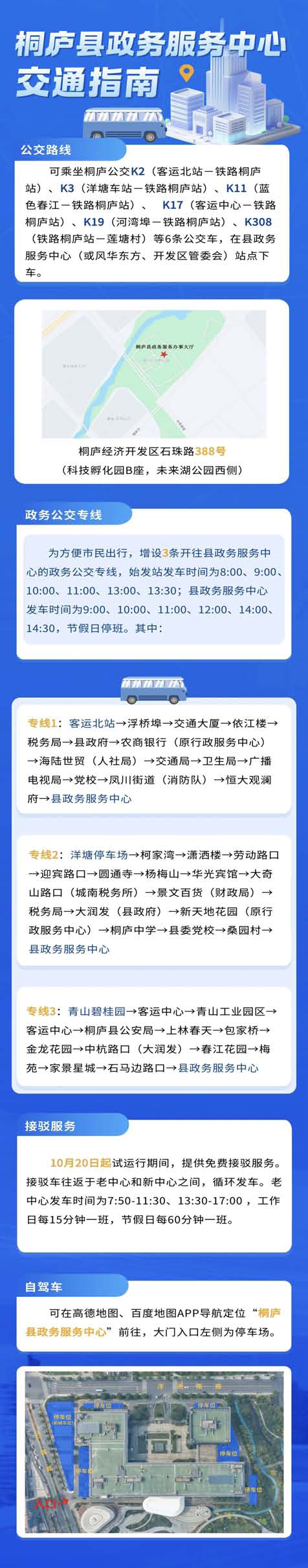 桐庐县政务服务中心交通指南 http://www.tlnews.com.cn/2025年10月14日 09:46:28 10月16日起,桐庐县政务服务办事大厅搬迁至桐庐经济开发区石珠路388号,10月20日起正式对外运行。许多市民朋友关心交通便利吗?哪几路公交可直达?自驾车停车位是否充裕?这份《桐庐县政务服务中心交通指南》请收好。 原标题: 桐庐县政务服务中心交通指南 作者: 网络编辑:俞俊