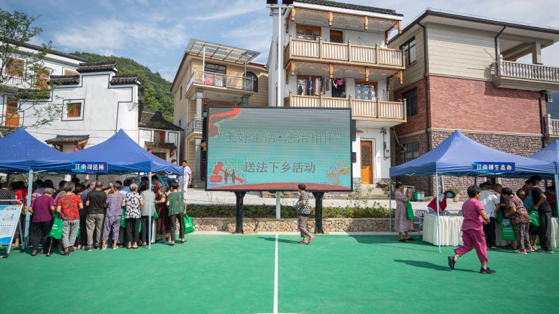 | 浙江在线9月18日讯(通讯员 章练)9月15日下午,桐庐江南镇彰坞村新建的法治公园迎来了第一场科普日暨送法下乡活动。公园篮球场内依次搭起8个帐篷,服务内容涵盖普法宣传、科学普及、垃圾分类、健康监测等,为彰坞村的村民们送去一份丰富的“大礼包”。