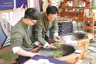 国家级非遗项目绿茶制作技艺(西湖龙井)省级非遗代表性传承人樊生华和他的徒弟严磊。
