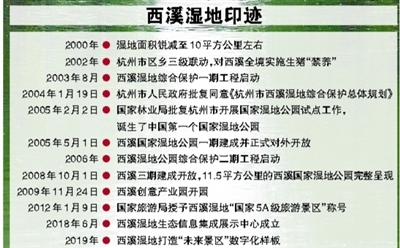 3月31日,习近平在杭州西溪国家湿地公园察看湿地保护利用情况。 新华社发 西溪,古称河渚,“曲水弯环,群山四绕,名园古刹,前后踵接,又多芦汀沙溆”。历史上的西溪占地约60平方公里,现实施保护的西溪湿地总面积约为11.5平方公里,分为东部湿地生态保护培育区、中部湿地生态旅游休闲区和西部湿地生态景观封育区。 西溪之重,重在生态。为加强生态保护,在湿地内设置了费家搪、虾龙滩、朝天暮漾、包家埭和合建港五大生态保护区和生态恢复区。入口处设湿地科普展示馆,西溪还是鸟的天堂,园区设有多处观鸟区及观鸟亭,给游客呈现出群鸟欢飞的壮丽景观。 2005年5月1日,西溪湿地以中国首个国家湿地公园的名义全新亮相,时任浙江省委书记习近平专门发去了贺信。 2020年3月31日,习近平总书记来到西溪湿地,沿着绿堤、福堤,察看湿地保护利用情况。 西溪湿地公园管委会办公室党委书记、主任何蕾动情地告诉记者:“总书记来到西溪湿地,提出了新的要求,是我们开园15年来最好的礼物。”
